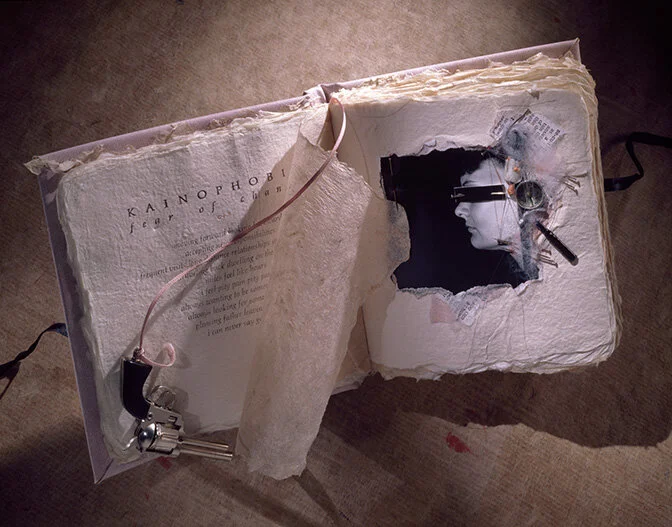 Opposite pages contain multi-layered collages constructed of roughly printed and torn photos of the artist with various materials glued, pinned and hand-sewn in place. The gelatin silver-print photographs depicting different parts of the body are pierced, cut and violated.